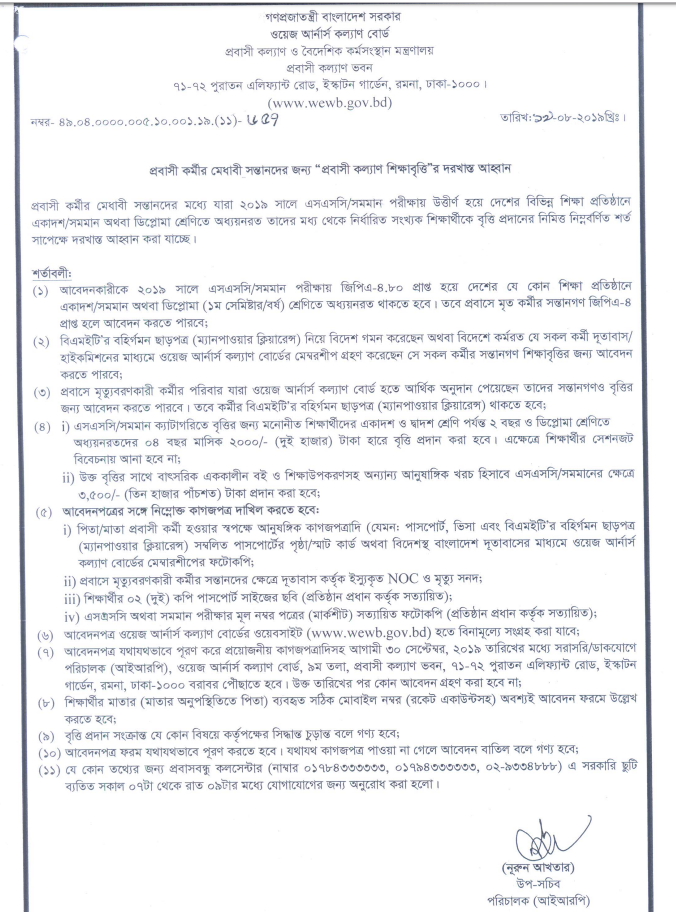 1 Ans Probasi kallyan Scholarship - WAGE EARNERS WELFARE BOARD (WEWB) scholarship circular and result 2019 - 2020 download